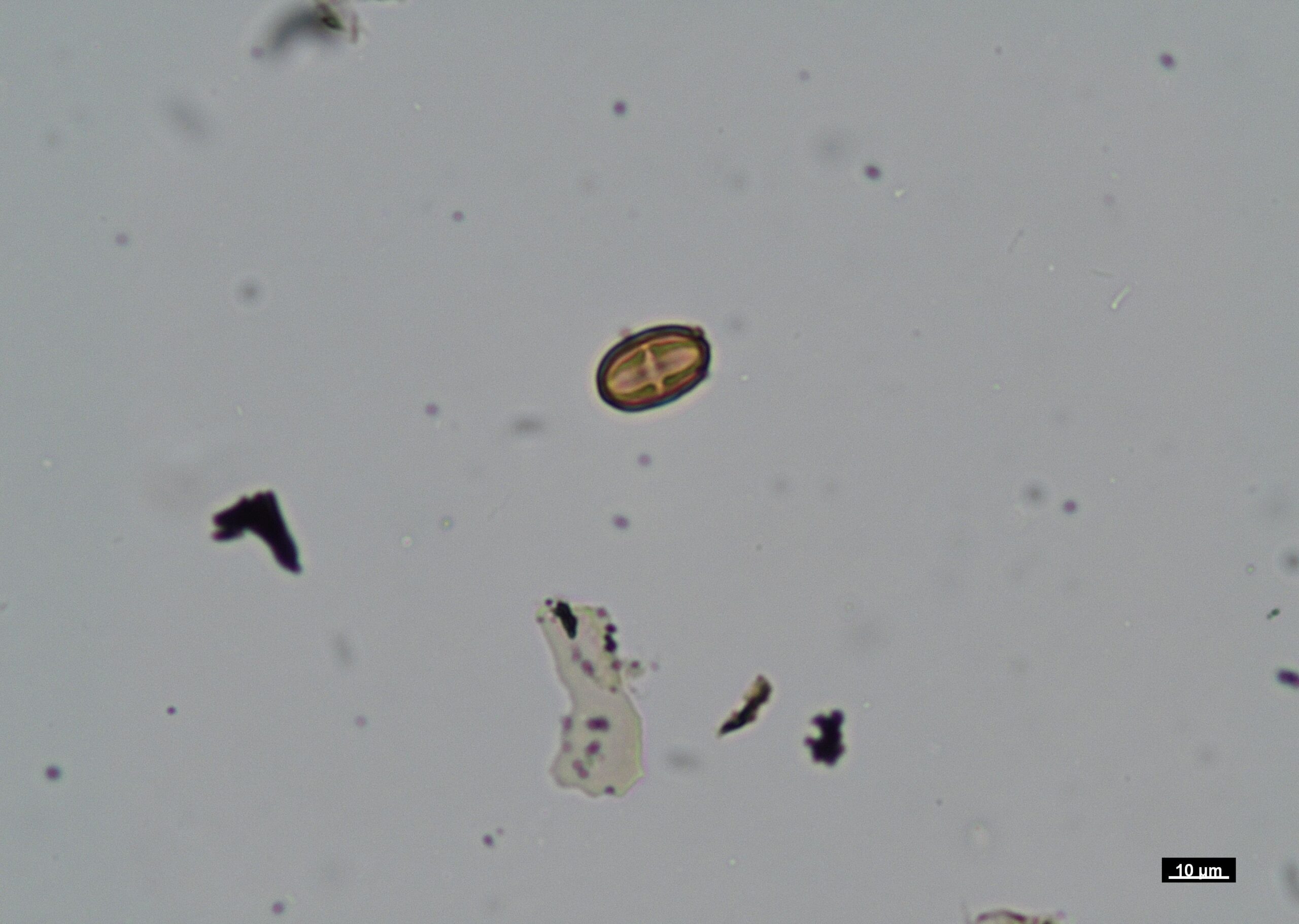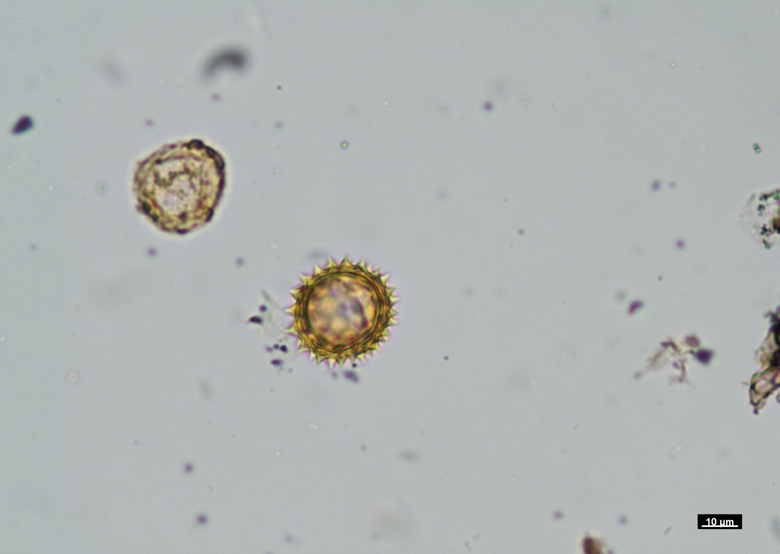 Pollen micrograph (Nikon Eclipse LV100 POL, scale bar 10 µm).